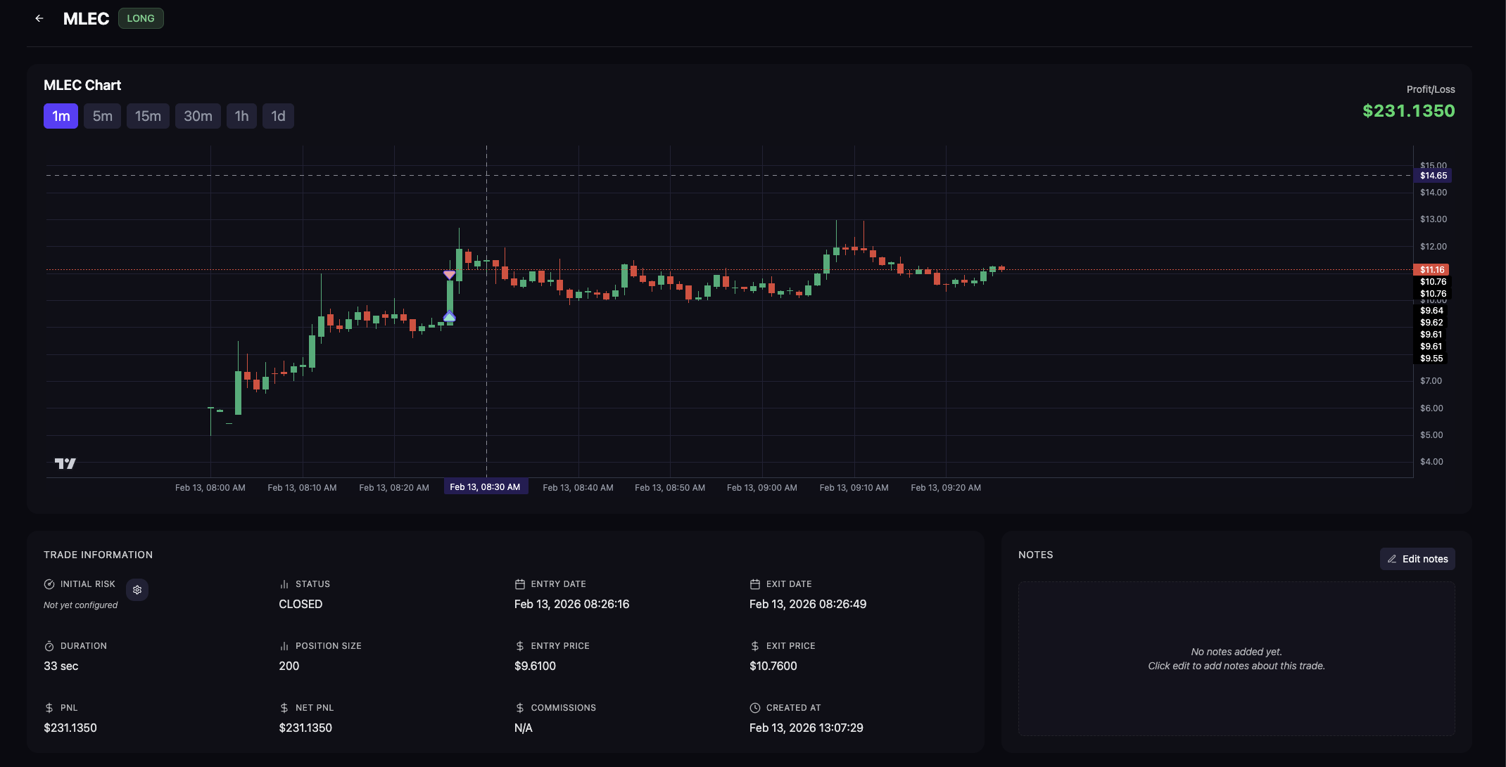 The morning delivered exactly what I’ve been waiting for — clean timing, decisive execution, and proper sizing on a small-cap momentum setup. I built into MLEC pre-market with 4 entries (50-share adds) for 200 shares total, and sold the full position into strength at $10.76.